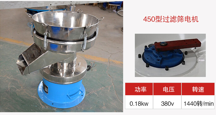 1、450液體過濾篩:電機(jī)功率0.18kw,電壓380v,轉(zhuǎn)速1440轉(zhuǎn)每分鐘。