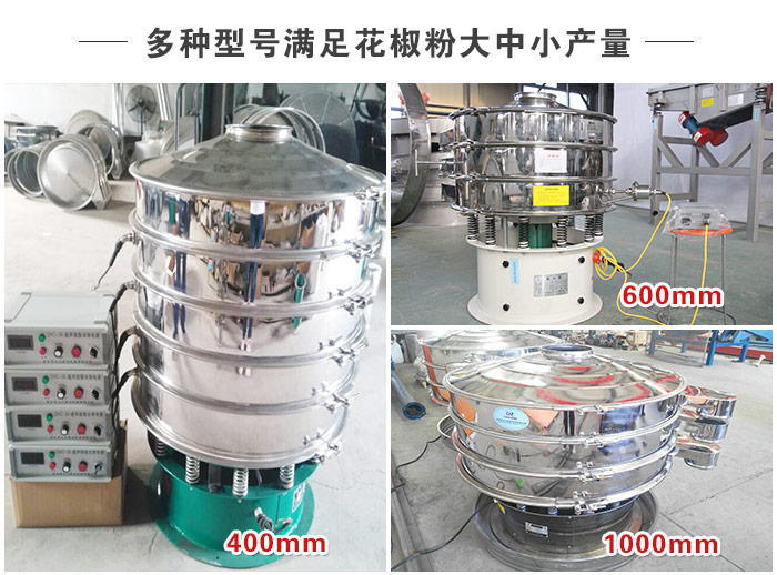 花椒粉除雜振動篩的型號分為直徑400mm、600mm、800mm、1000mm、1200mm、1500mm、1800mm、2000mm等八種標準機型。