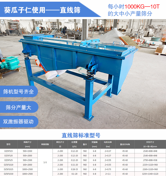 總結:直線篩相比旋振篩的優勢在于篩分產量上的提升,大型號的直線篩可滿足每小時10噸的產量求,大產量葵瓜子仁篩分就選直線篩!