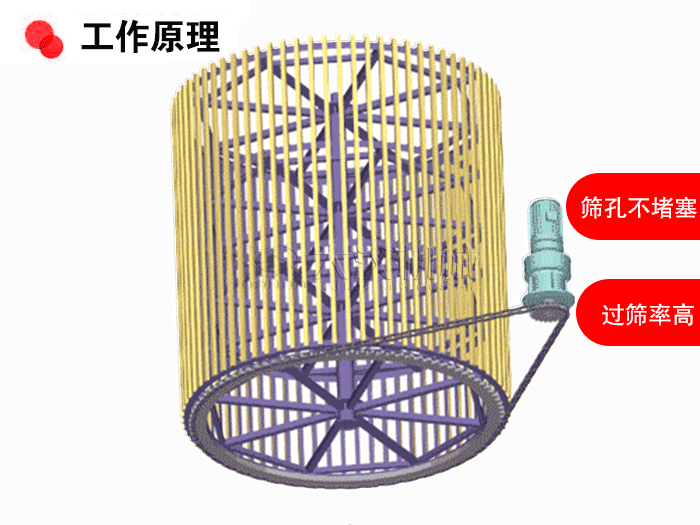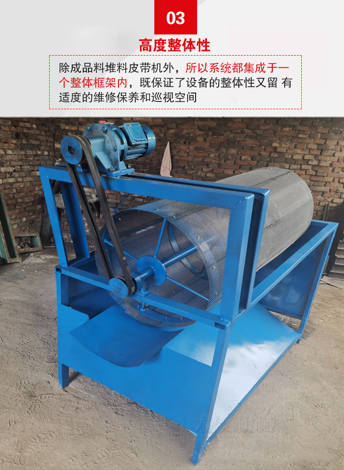 該產(chǎn)品的主要依靠驅(qū)動裝置帶動滾筒篩網(wǎng),對于物料做360°旋轉(zhuǎn)時篩分,在滾動篩網(wǎng)的作用下,物料能夠輕松的達(dá)到分散的狀態(tài),從幫助篩網(wǎng)進(jìn)行快速的篩分。通過篩網(wǎng)網(wǎng)孔的物料留到皮帶輸送機(jī)上,由出料口排出,而沒有通過篩網(wǎng)篩分的將從肥料口排出,從而完成物料的篩分目的。