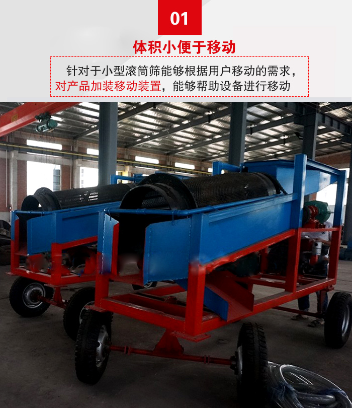 針對于小型滾筒篩能夠根據(jù)用戶移動的需求,對產(chǎn)品加裝移動裝置,能夠幫助設(shè)備進(jìn)行移動,從而滿足用戶的需求。