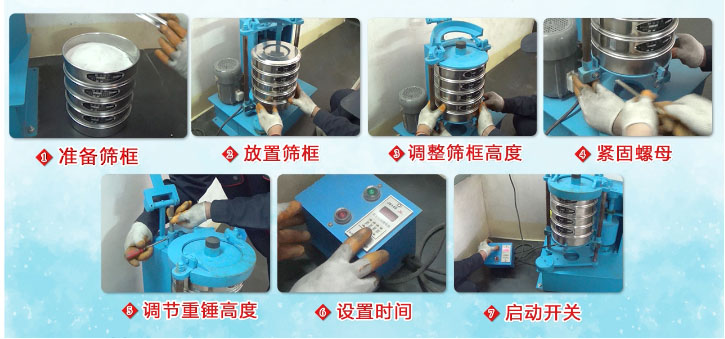 粒度振篩機(jī)電機(jī)通過(guò)同步帶,帶動(dòng)齒輪變速后使主軸轉(zhuǎn)動(dòng),主軸帶動(dòng)偏心輪使滑板帶動(dòng)試驗(yàn)篩左右搖動(dòng),同時(shí)帶動(dòng)頂桿齒輪轉(zhuǎn)動(dòng),頂擊拍錘,拍擊試驗(yàn)篩,使試驗(yàn)篩、分樣篩中的物料篩分。