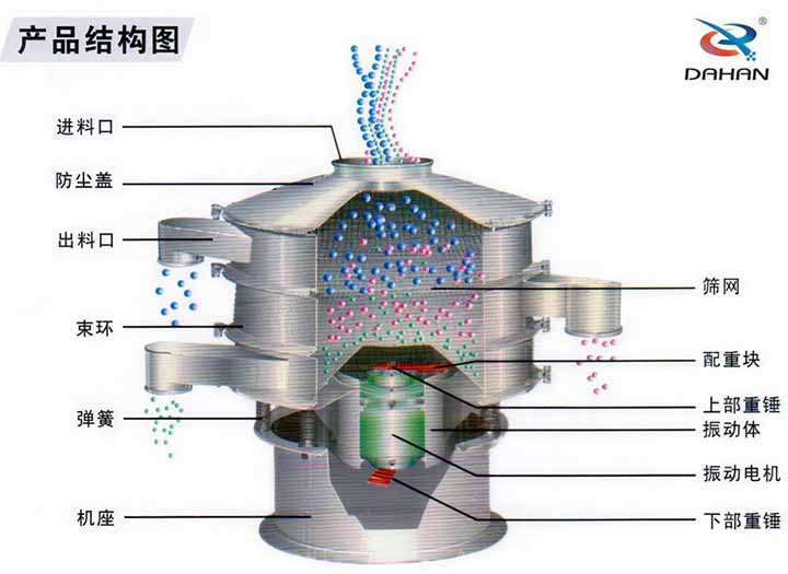 圓振動篩效率高、設計精巧耐用,粉類、粘液均可篩分; 換網容易、操作簡單、清洗方便; 網孔不堵塞、粉末不飛揚、可篩至400目或0.028mm;雜質、粗料自動排出,可以連續作業。